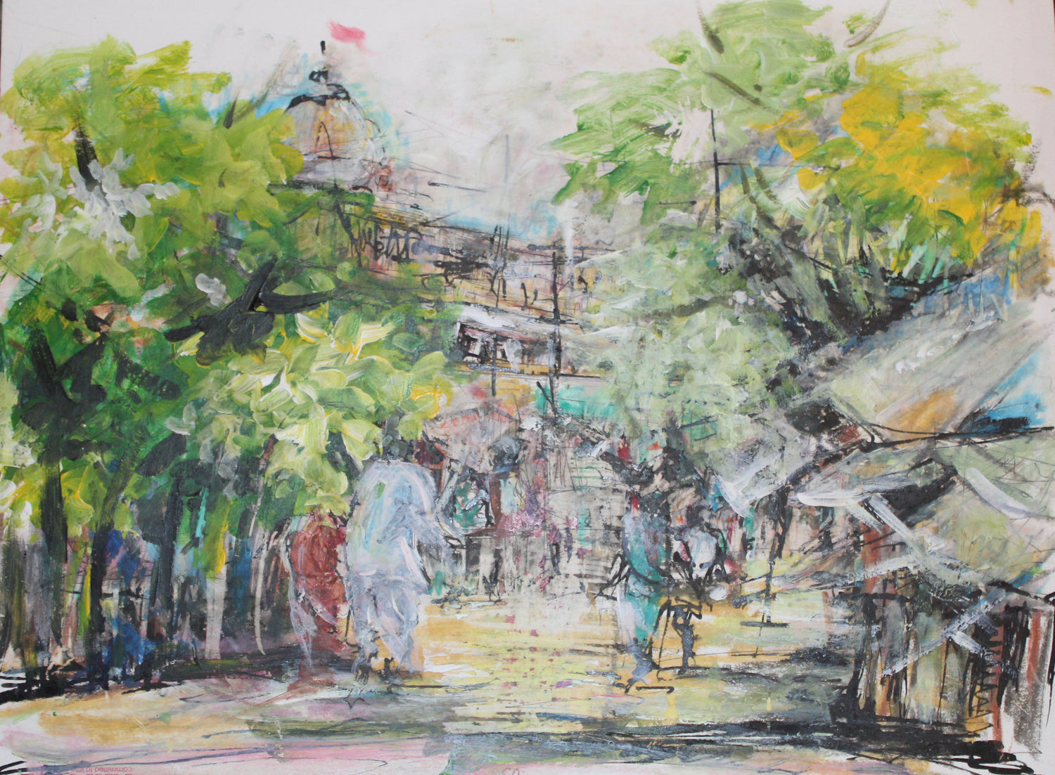 Original Ink Wash Riverfront Drawing – Indian Ghats & Boats Illustration – Black & White Cultural Landscape Art (SB)