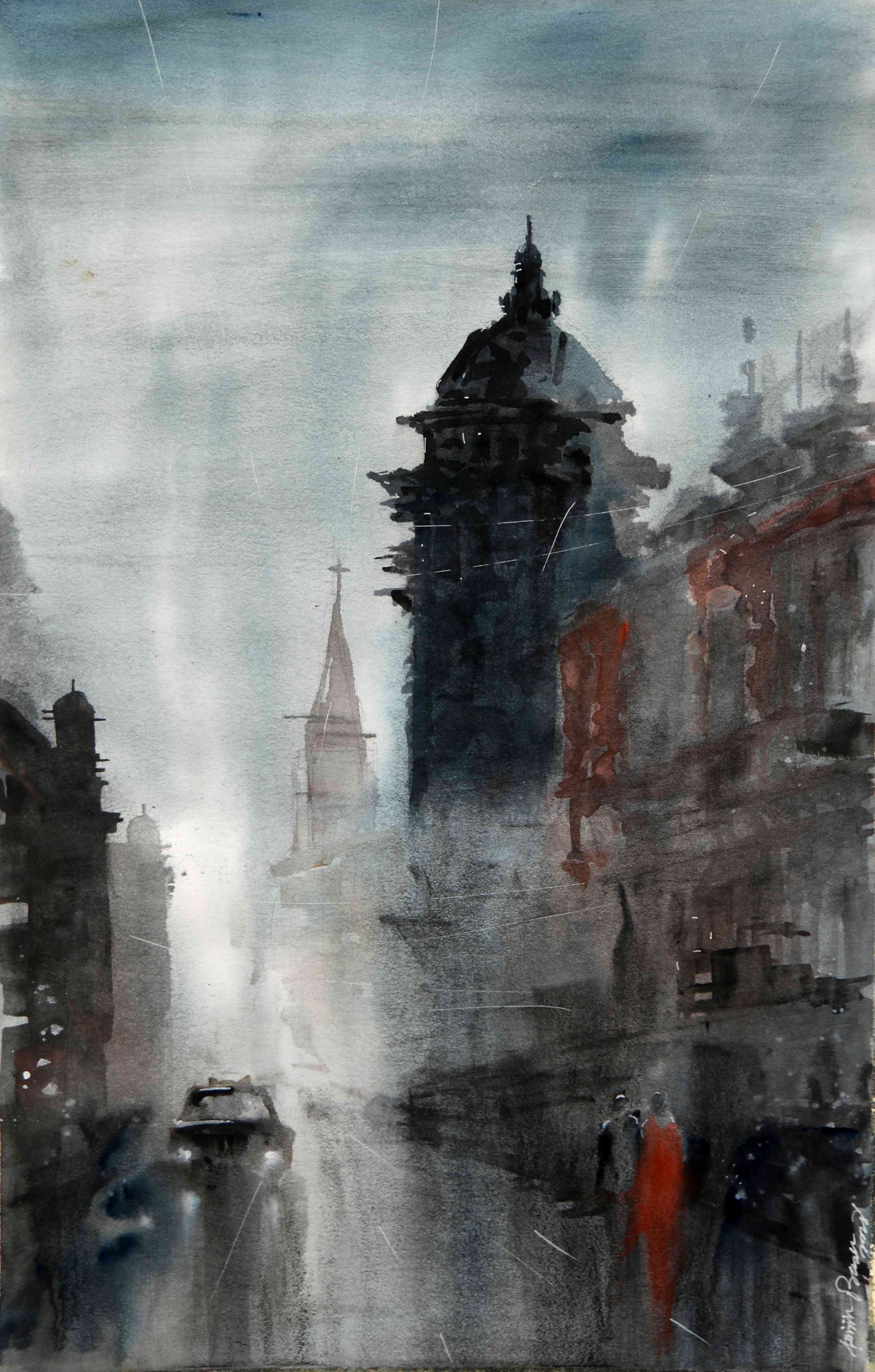 Cityscape in Mist is a contemporary cityscape painting by Indian artist Arijit Basu, capturing the quiet drama of an urban street dissolving into fog and light. Layered washes, softened architecture, and distant human figures evoke movement, memory, and solitude within the city.