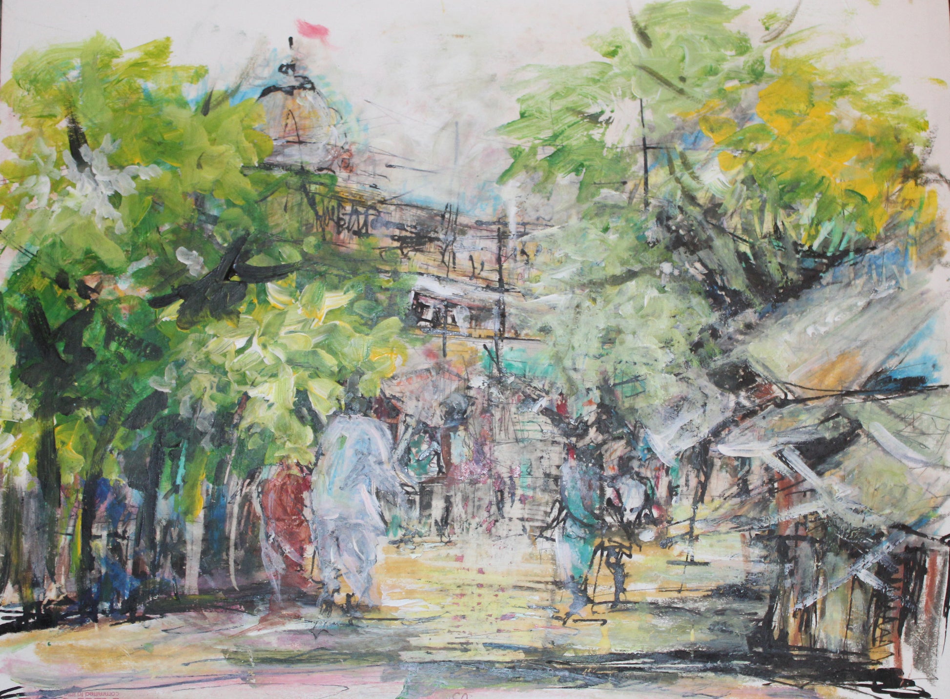 Bring the energy and color of everyday life into your home with this original mixed-media street scene painting, created by Sunanda Bose. This expressive artwork captures the vibrancy of an Indian marketplace, where people, bicycles, trees, and rustic structures blend into a lively tapestry of movement and color.